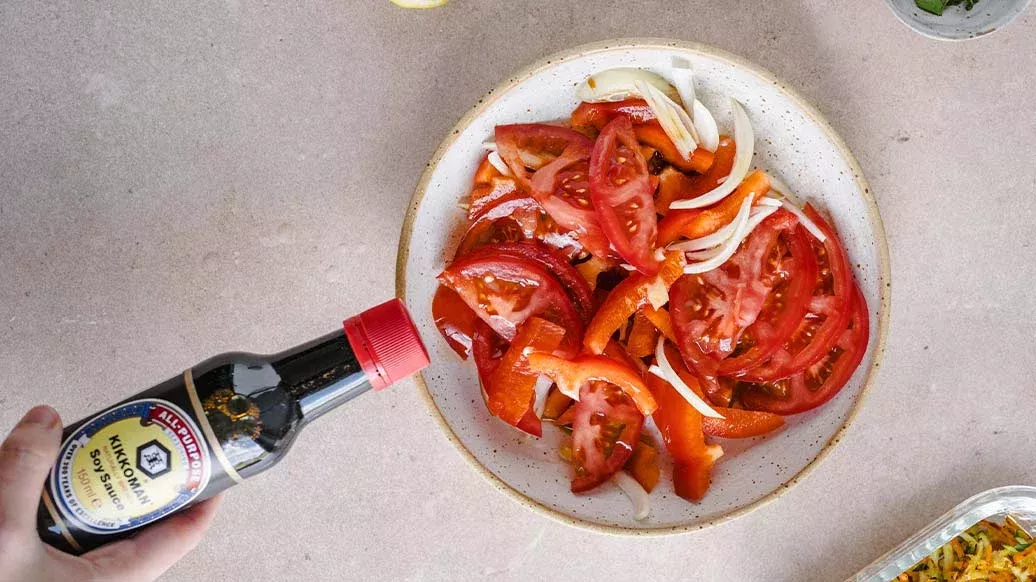 0,5 punainen paprika – 1 tomaatti – 0,25 sipuli – 1 rkl oliiviöljyä – 1 rkl Kikkoman luonnollisesti valmistettu soijakastike – 1 rkl sitruunamehua