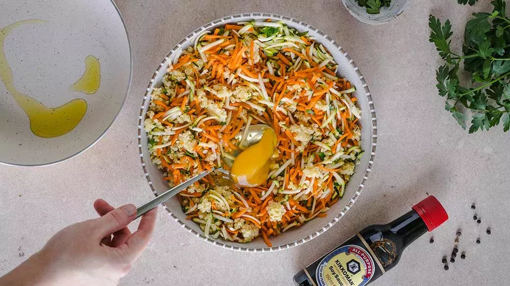 100 g keitettyä hirssiä – 0,25 kesäkurpitsa – 1 porkkana – 1 kananmuna – 0,5 tl pippuria – 1 rkl silputtua persiljaa – 2 rkl oliiviöljyä