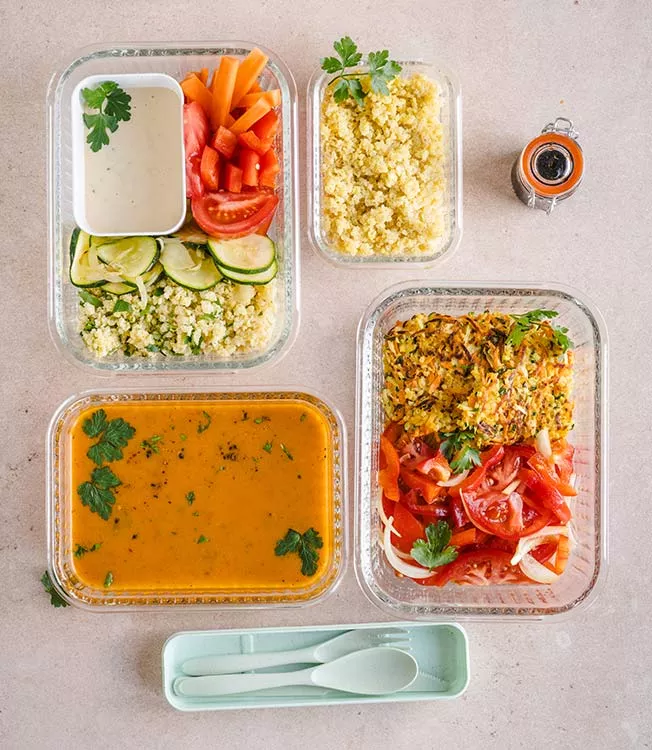 Leikkaa porkkana tikuiksi, tomaatti neljään lohkoon ja paprika kuutioiksi. Laita kaikki ainekset eväsrasiaan.