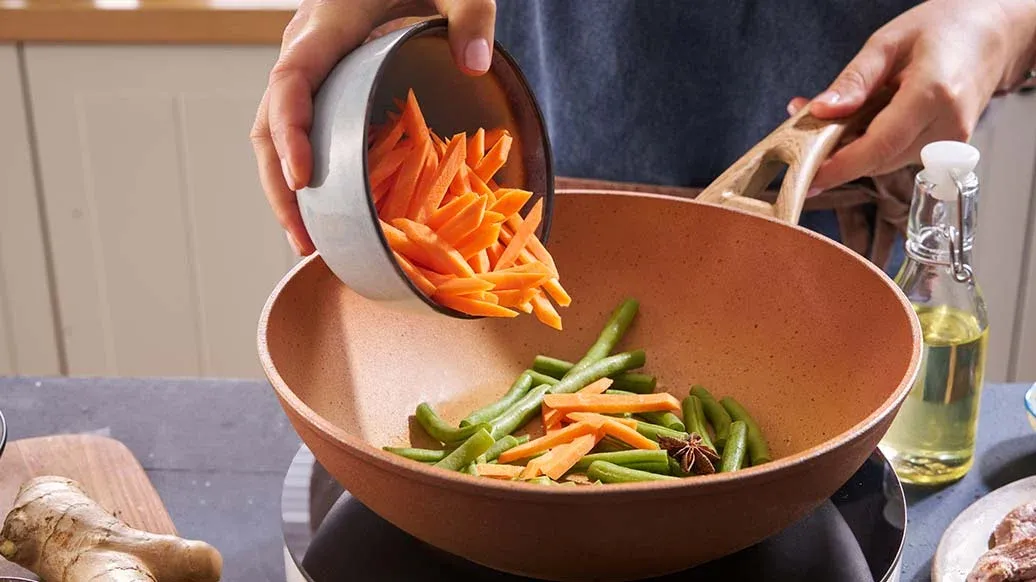 15 ml kasviöljyä – 2 cm pala inkivääriä raastettuna – 80 g porkkanaa tulitikuiksi leikattuna – 100 g vihreitä papuja paloiteltuna – 1 tähtianis – 80 ml vettä