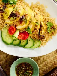 Keitä riisi suolatussa vedessä pakkauksen ohjeen mukaan ja pidä riisi lämpimänä. Puhdista ja huuhdo purjo, ja pilko n. 1 cm paksuisiksi renkaiksi. Kaada pannulle 1 tl öljyä ja kuullota purjo.