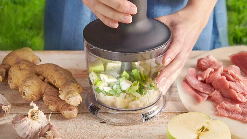 Soseuta pilkottu valkosipuli, omena, inkivääri ja kevätsipuli yleiskoneessa tai tehosekoittimessa sileäksi tahnaksi.