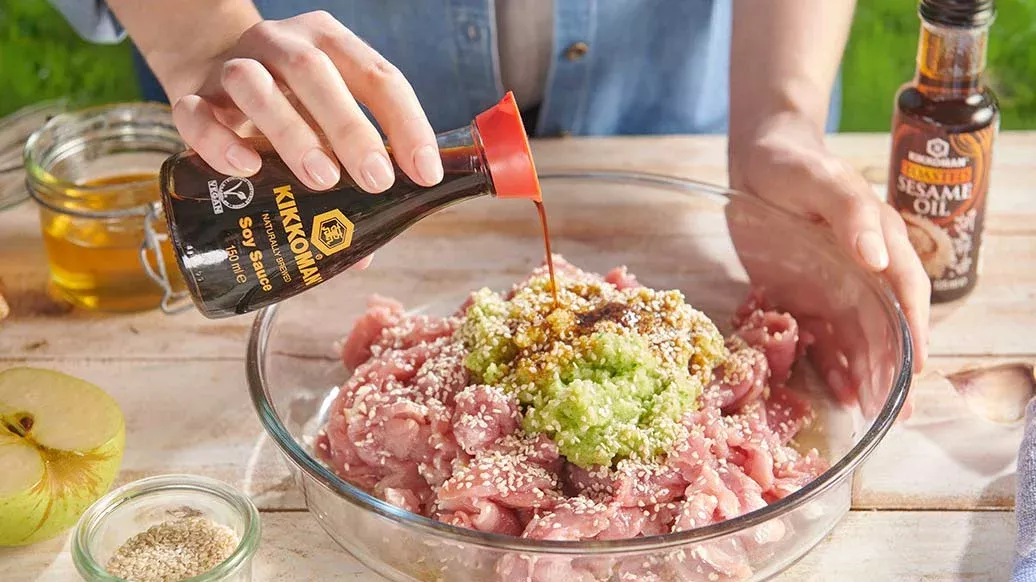 Lisää vaiheessa 2 valmistettu tahna ja loput aineksista (Kikkomanin seesamiöljy, hunaja, pippuri, Kikkomanin soijakastike ja paahdetut seesaminsiemenet) lihasiivujen sekaan. Marinoi lihaa ainakin 1 tunti, mielellään yön yli.