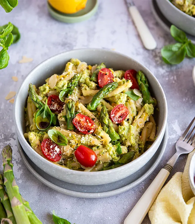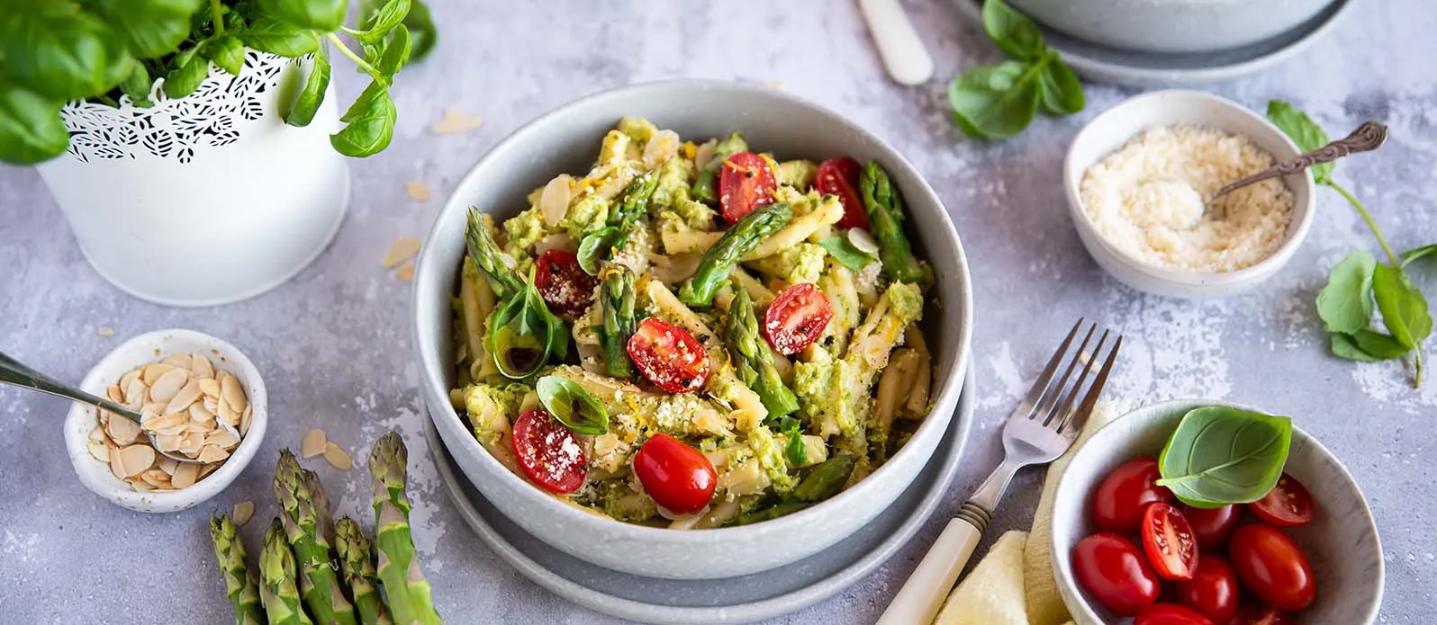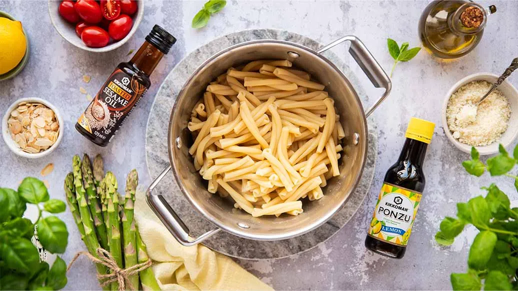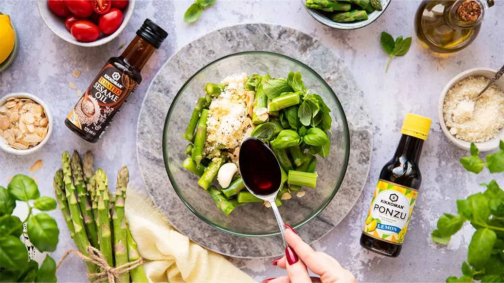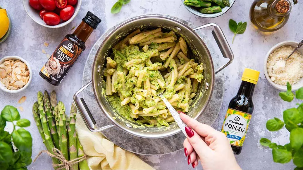 Keväinen pasta parsapestolla ja Kikkoman ponzu-sitrussoijakastikkeella on nopeatekoinen ateria tulvillaan makua. Kikkoman seesamiöljy antaa pestolle pähkinäistä, paahteista syvyyttä, joka sopii täydellisesti mantelilastujen kera.