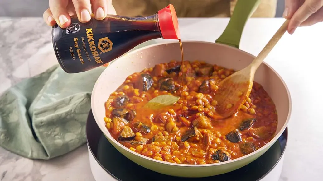 Lisää paseerattu tomaatti vaiheen 1 kasvisten joukkoon ja mausta Kikkoman soijakastikkeella. Keitä 5 minuuttia.