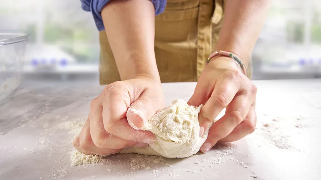 200 g vehnäjauhoa – 20 g vehnäjauhoa kaulimiseen – ½ tl leivinjauhetta – ½ tl ruokasoodaa – 40 ml maitoa kädenlämpöisenä – 75 g maustamatonta jogurttia