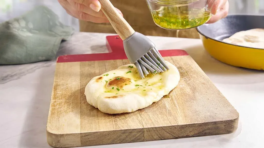 Kuumenna kuiva pannu (keskilämpö/kova lämpö) ja paista kutakin naan-leipää 2 minuuttia per puoli, kunnes niihin alkaa tulla kullanruskeita ja hiiltyneitä kohtia. Sulata kirkastettu voi pienessä kattilassa ja lisää sitten silputtu valkosipuli ja korianteri. Leikkaa sipuli rinkuloiksi. Sivele naan-leivät valkosipulivoilla ja koristele dal korianterin lehdillä ja sipulirinkuloilla.