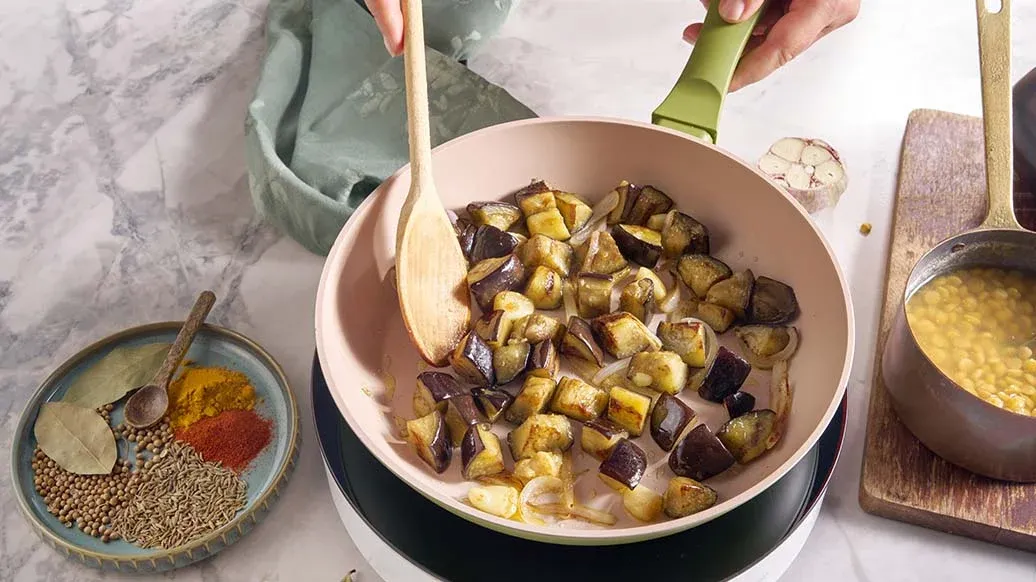 Leikkaa valkosipulin yläosa pois niin, että kynsien kärjet paljastuvat. Voitele öljyllä ja paista 180-asteisessa uunissa n. 30 minuuttia. Keitä chana dalia kasvisliemessä 40 minuuttia. Kuullota pannulla sipulia ja munakoisoa kirkastetussa voissa 5 minuuttia, kunnes ne ovat kullanruskeita. Puristele paahdetut valkosipulinkynnet kuoristaan ja lisää ne pannulle. Lisää kumina, kurkuma, korianterin siemenet, savupaprika sekä laakerinlehti ja paista 10–15 sekuntia vapauttaaksesi aromit.
