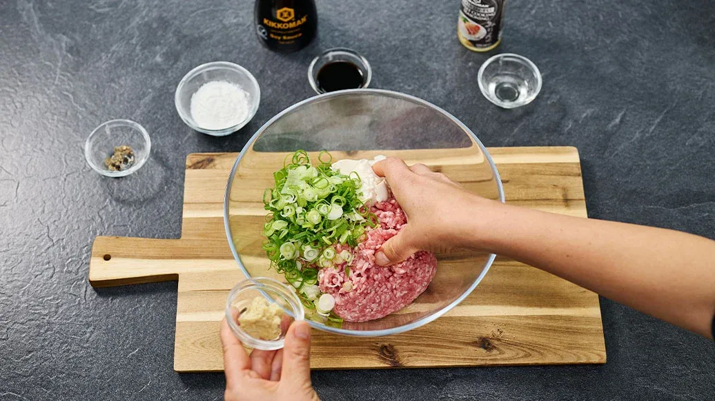 Sekoita kulhossa hyvin jauheliha, murustettu tofu, silputut kevätsipulit, raastettu inkivääri, Kikkoman soijakastike, Kikkoman mirin-tyylinen makea kastike sekä mustapippuri. Muotoile pyöryköiksi.