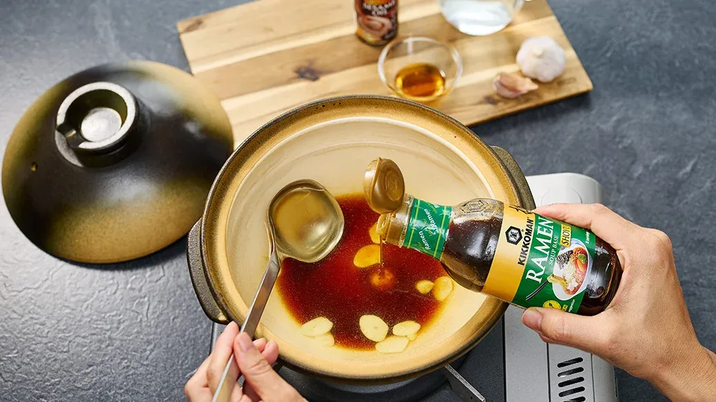 Lisää kattilaan vesi, Kikkoman ramen-liemipohja, Kikkoman seesamiöljy sekä valkosipuli siivuina.