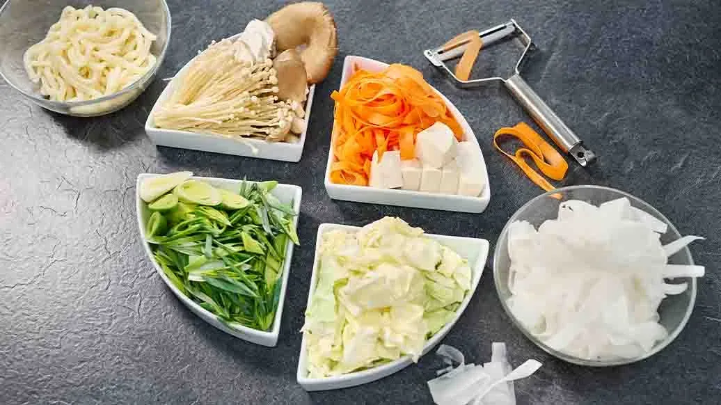 Leikkaa kiinankaali suupaloiksi. Viipaloi purjo vinottain. Poista tarvittaessa sienistä kannat ja irrottele sienet toisistaan. Leikkaa kuorimaveitsellä ohuita suikaleita retikasta ja porkkanoista. Leikkaa tofu 8 palaan.