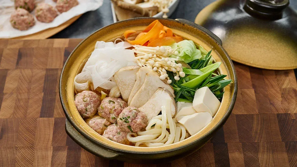 Tätä tukevaa ateriaa tarjottiin aikoinaan sumopainijoille, jotka tarvitsivat voimaa ja kestävyyttä. Lihapullat, kasvikset ja nuudelit saavat makua Kikkoman ramen-liemipohjasta sekä Kikkoman seesamiöljystä. Hot pot tarjoillaan dippien kera.