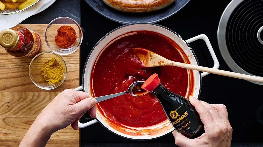 Paista bratwursteja kuumassa öljyssä n. 8–10 minuuttia, kunnes ne ovat joka puolelta kullanruskeita. Mausta tomaattikastike Kikkomanin soijakastikkeella, curryjauheella, paprikajauheella sekä Kikkomanin kimchi-chilikastikkeella. Leikkaa bratwursti paloiksi ja lisää kastikkeen sekaan. Lämmitä hetki ja tarjoile ranskalaisten ja Kikkoman ponzu-majoneesin kera.
