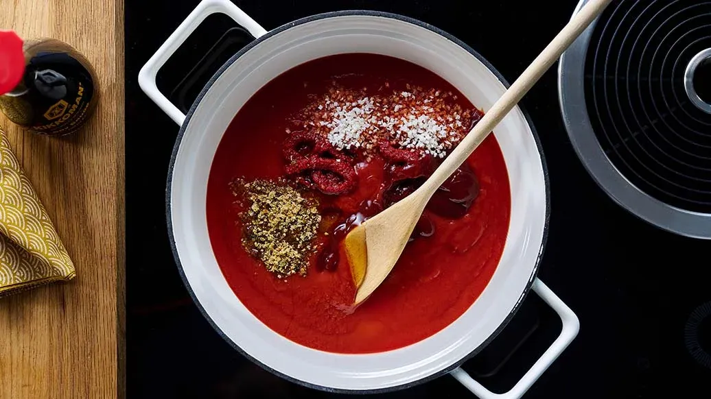 Sekoita kattilassa tomaatit, tomaattisose, hunaja, murennettu kasvisliemikuutio sekä sipuli, kiehauta ja anna kiehua hiljaa n. 10 minuuttia.