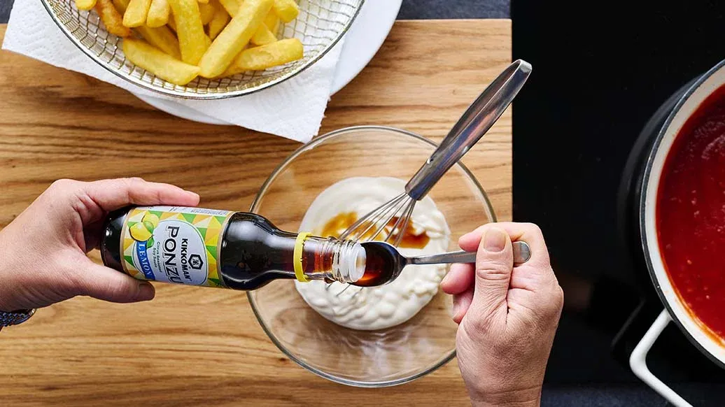 Saksalainen katuruokaklassikon kastike maustuu täyteläiseksi Kikkomanin soijakastikkeella ja Kikkoman kimchi-chilikastikkeella. Kikkoman ponzu-sitrussoijakastikkeella maustettu majoneesi maistuu ihanalta ranskalaisten kanssa.