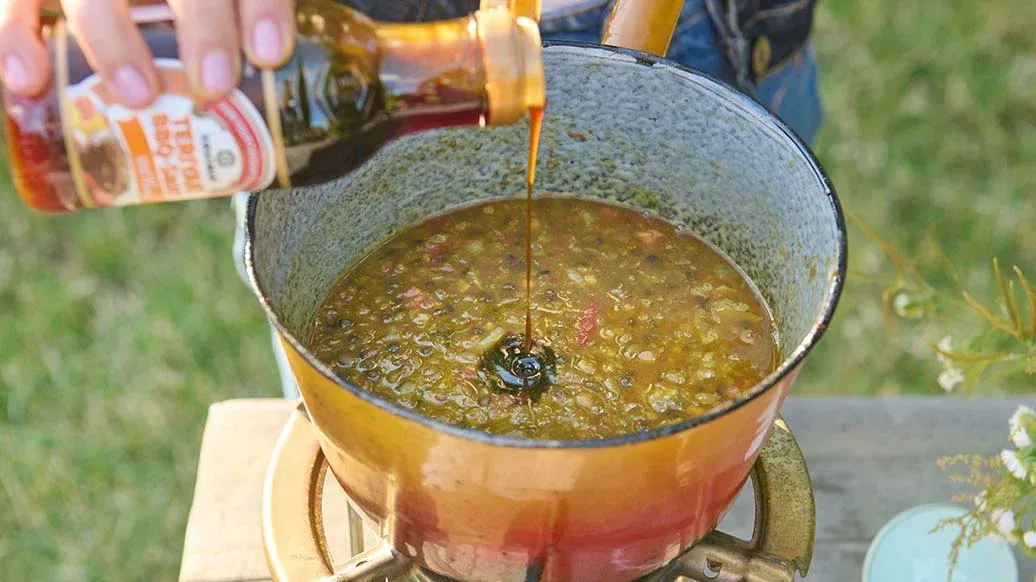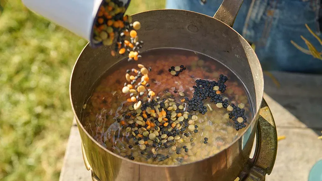 Laita linssit isoon kattilaan kasvisliemen tai veden kanssa. Kiehauta keskilämmöllä. Alenna lämpöä ja anna kiehua hiljaa 20–25 minuuttia, kunnes linssit ovat pehmeitä ja kypsiä. Sekoita välillä. Lisää vettä tarvittaessa, jotta saat muhennoksesta halutun paksuista.