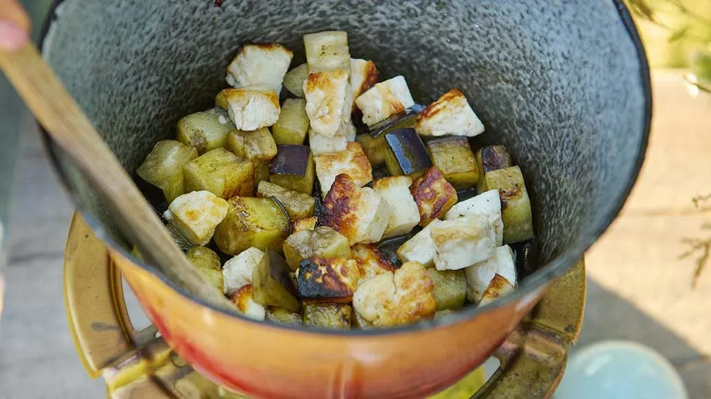 Kuumenna oliiviöljy pannulla keskilämmöllä. Lisää munakoisokuutiot ja kypsennä välillä sekoittaen 8–10 minuuttia, kunnes ne pehmenevät ja ruskistuvat hiukan. Poista pannulta ja jätä odottamaan.