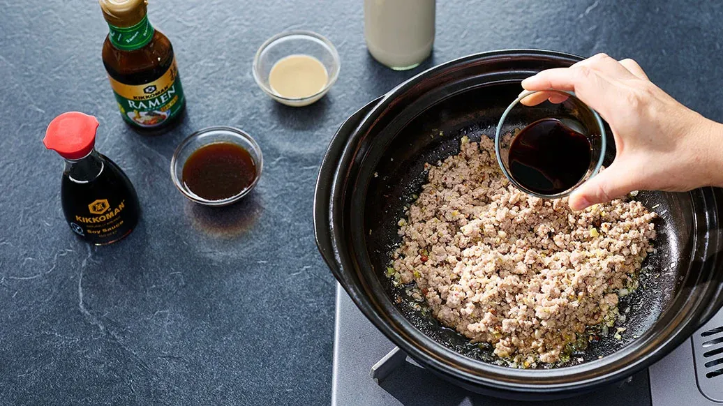 Kuumenna Kikkoman seesamiöljy kattilassa. Lisää silputtu valkosipuli, inkivääri, vaiheessa 1 silputtu purjon valkoinen osa, sichuaninpippuri sekä chilirouhe ja sekoita, kunnes ainekset alkavat tuoksua. Lisää jauheliha ja ruskista. Lisää tahini, Kikkoman soijakastike, Kikkoman ramen-liemipohja, suola ja soijamaito. Sekoita hyvin.