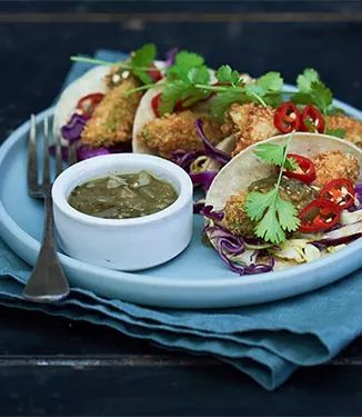 Poista kaalista uloimmat lehdet ja kanta ja leikkaa ohuiksi suikaleiksi. Sekoita kaalisuikaleet ja Poke-kastike keskenään. Poista chilipaloista siemenet ja kannat, huuhdo vedellä ja leikkaa ohuiksi renkaiksi. Lämmitä tortillat pakkauksen ohjeen mukaan. Täytä tortillat avokadoilla, Poke-kaalilla, chilirenkailla ja korianterilla ja tarjoa tomatillo-salsan kanssa.
