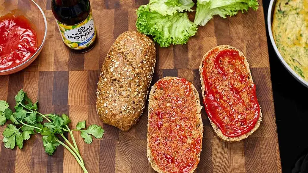 Halkaise sämpylät ja paahda leikkuupintoja erillisellä pannulla voissa. Sekoita ketsuppi, Kikkoman ponzu-sitrussoijakastike sekä tomaattisose ja levitä seos sämpylöiden leikkuupinnoille. Huuhtele salaatinlehdet ja taputtele kuiviksi. Asettele sämpylöiden alapuoliskoille salaatinlehti, kasvis-munaseosta sekä korianterinlehtiä. Laita sämpylän yläpuoli päällimmäiseksi ja tarjoile.