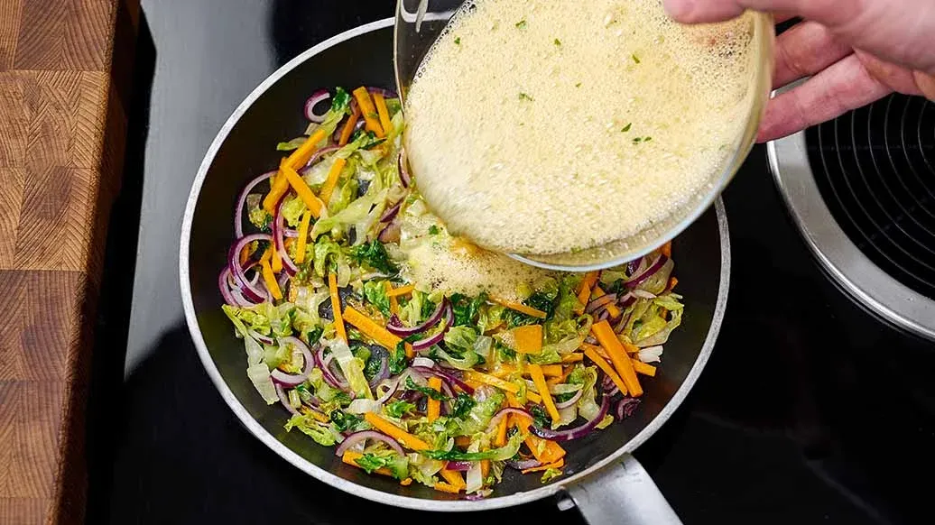 Kaada muna-pinaattiseos kasvisten päälle ja anna hyytyä.