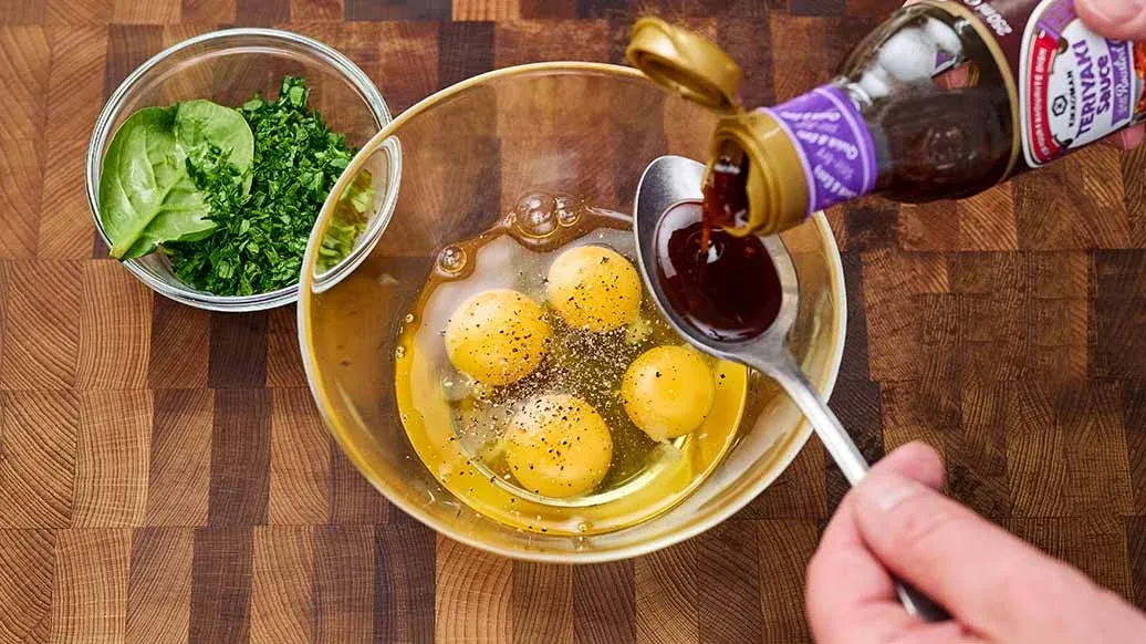 Huuhtele pinaatti ja silppua hienoksi. Vatkaa sekaisin kananmunat sekä Kikkoman teriyakikastike paahdetulla valkosipulilla, mausta pippurilla ja sekoita joukkoon pinaatti.