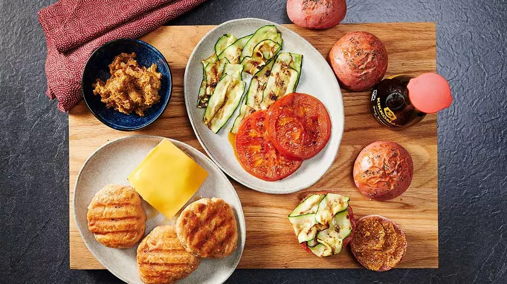 Mehukkaat grillatut lohiburgerit hiiligrillatuilla tomaateilla ja kesäkurpitsalla sekä viikunasinapilla. Kauniit kotitekoiset burgerisämpylät saavat luonnollisen värinsä punajuuresta ja keltaisesta maustekurkumasta!