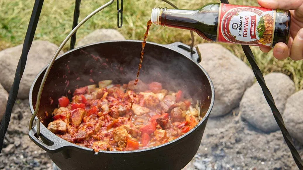 Lisää pataan tomaattisose, paprikajauhe sekä kumina ja jatka kypsentämistä minuutin ajan. Kaada sekaan liha- tai kasvisliemi ja anna kiehua hiljaa 35–40 minuuttia, tai kunnes liha on kypsää. Mausta keitto Kikkomanin teriyaki-marinadilla. Koristele gulassi murustetulla fetalla, viipaloiduilla oliiveilla, sitruunan lohkoilla sekä silputulla persiljalla ja tarjoile kuumana.