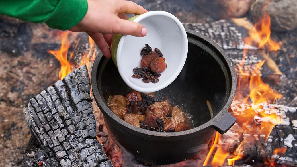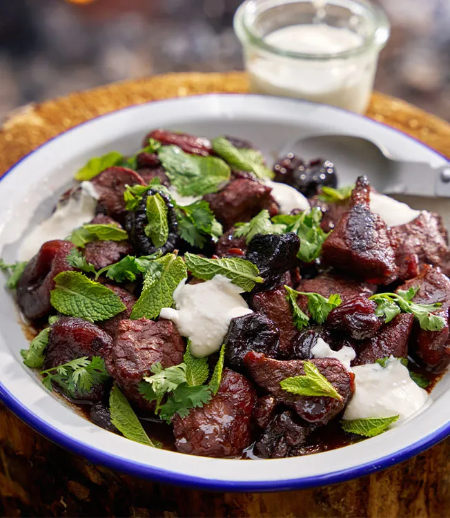 Lammas hautuu meheväksi kuivattujen aprikoosien ja luumujen sekä rusinoiden kera. Se tarjoillaan Kikkoman yuzu ponzu -kastikkeella maustetun jogurtin kera.