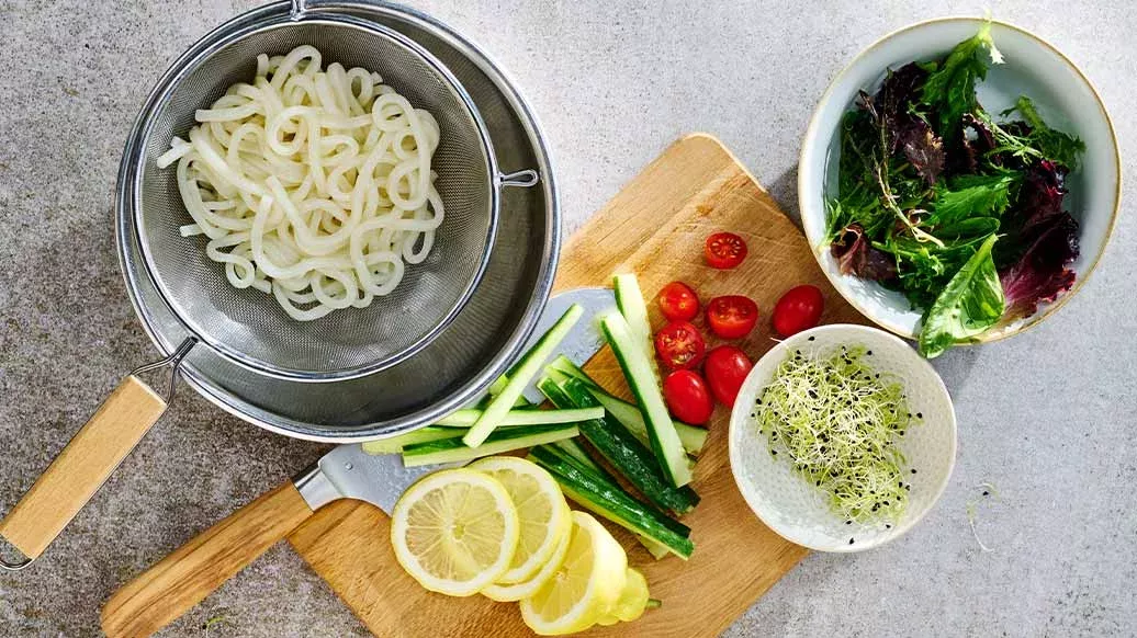 Keitä nuudelit paketin ohjeiden mukaan. Huuhtele kylmässä vedessä ja valuta. Huuhtele ja paloittele kasvikset.