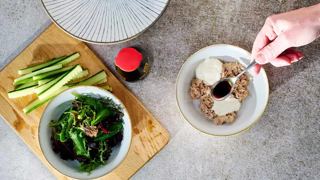 Sekoita tonnikala majoneesin ja Kikkomanin soijakastikkeen joukkoon.
