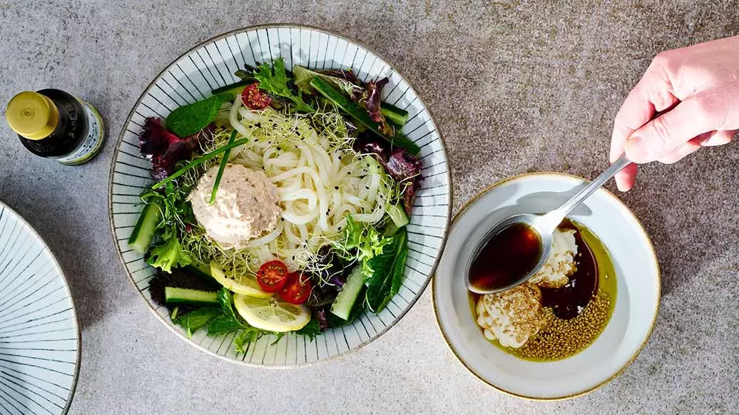 Asettele salaatti syvälle lautaselle ja lisää sen päälle udon-nuudelit, kasvikset ja tonnikala. Kaada kastike annoksen päälle.