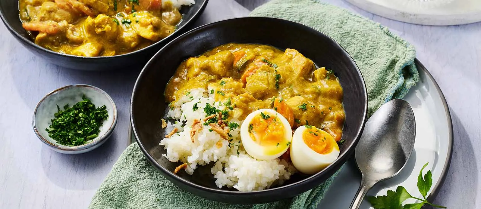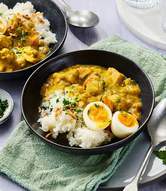 Annostele riisi lautasille ja kauho currya päälle. Koristele kananmunilla, paahdetulla sipulilla ja persiljalla.