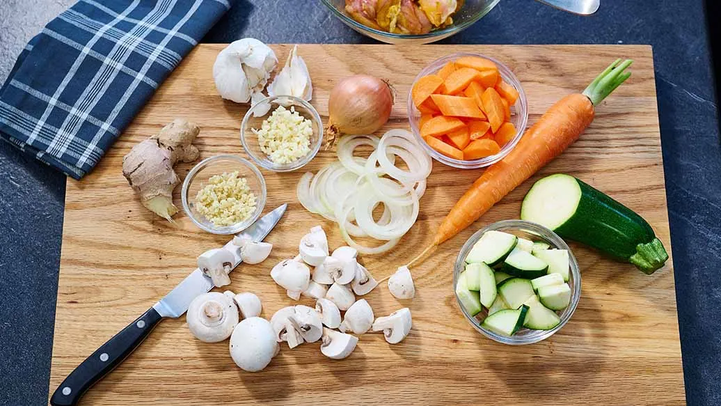 Silppua valkosipuli ja inkivääri. Leikkaa sipuli siivuiksi ja porkkana sekä kesäkurpitsa 3 cm paloiksi. Paloittele herkkusienet neljään osaan.