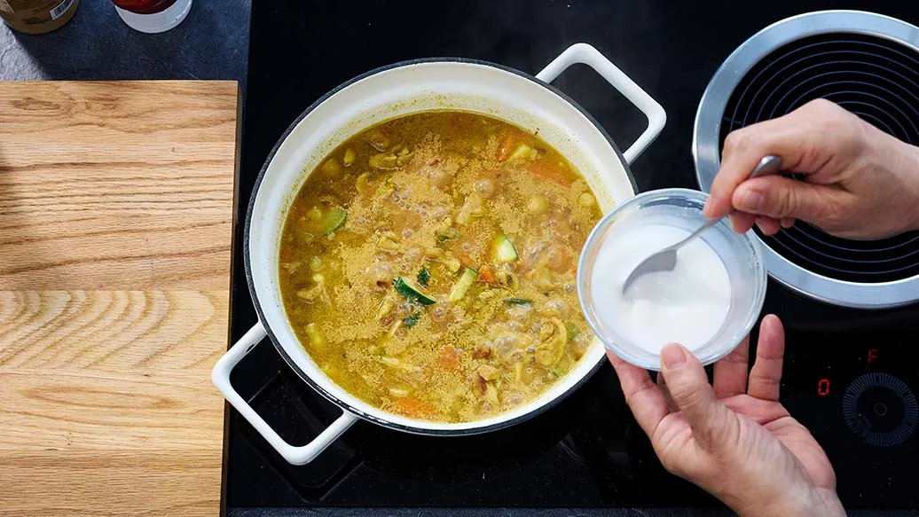 Sekoita maissitärkkelys veteen. Lisää seos curryyn ja sekoita jatkuvasti, kunnes kastike alkaa hiukan kiehua ja sakenee. Lisää garam masala aivan keittämisen loppuvaiheessa ja ota pannu pois liedeltä.