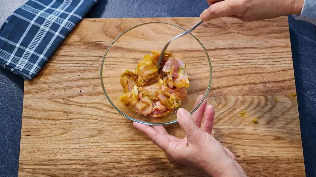 Leikkaa kana suupaloiksi ja sekoita palojen joukkoon curry ja suola.