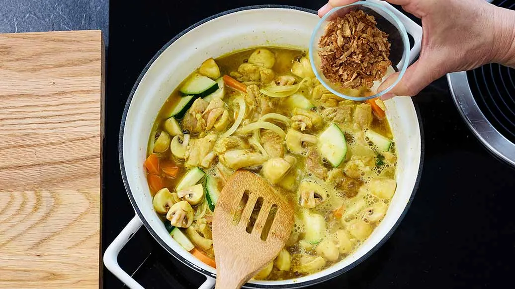 Kuumenna rypsiöljy kattilassa alhaisella tai keskilämmöllä. Lisää silputtu valkosipuli sekä inkivääri ja kuullota, kunnes ne alkavat tuoksua. Lisää vaiheessa 1 maustettu kana ja kypsennä varovasti, jottei kana pala. Lisää sipuli, porkkanat sekä kesäkurpitsa ja kuullota hetki. Sekoita sitten joukkoon curry ja herkkusienet. Kaada sekaan vesi, lisää paahdettu sipulirouhe ja kuori pinnalle mahdollisesti muodostuva vaahto. Peitä kannella ja anna kiehua hiljaa 15 minuuttia.