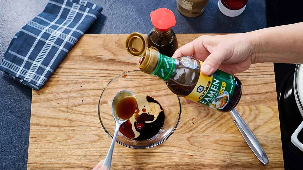 Kun kasvikset ovat kypsiä, sekoita kulhossa Kikkoman soijakastike, Kikkoman ramen-liemipohja, ketsuppi ja tahini sileäksi tahnaksi. Lisää pannulle ja sekoita hyvin.