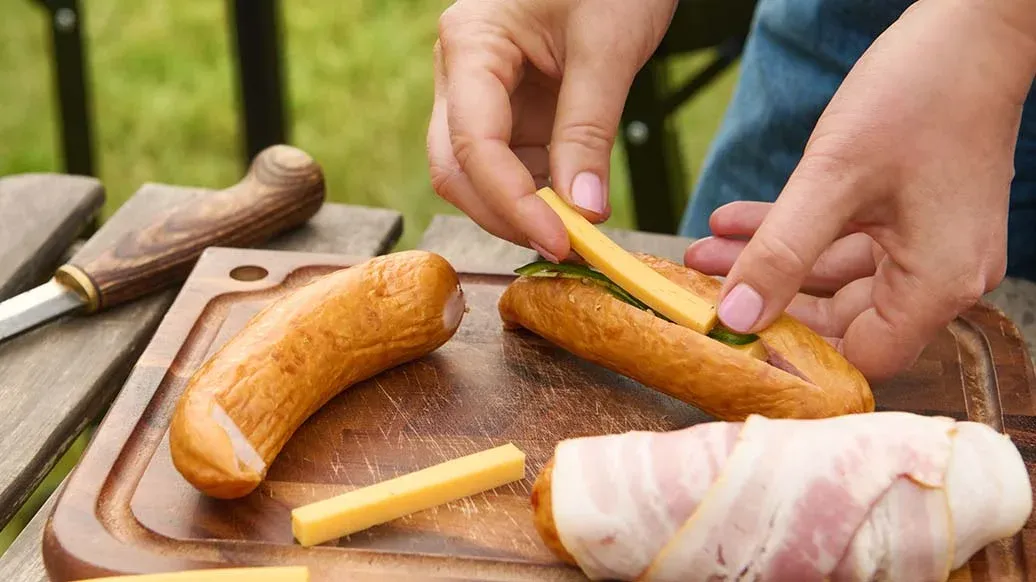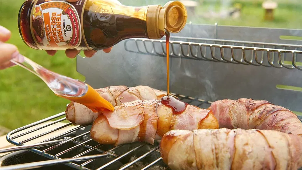 Juustolla ja jalapenoilla täytetyt makkarat kääritään rapeaan pekoniin ja niihin sivellään Kikkomanin teriyaki BBQ-kastiketta ennen grillaamista – täydellinen yhdistelmä mausteista ja makeaa.