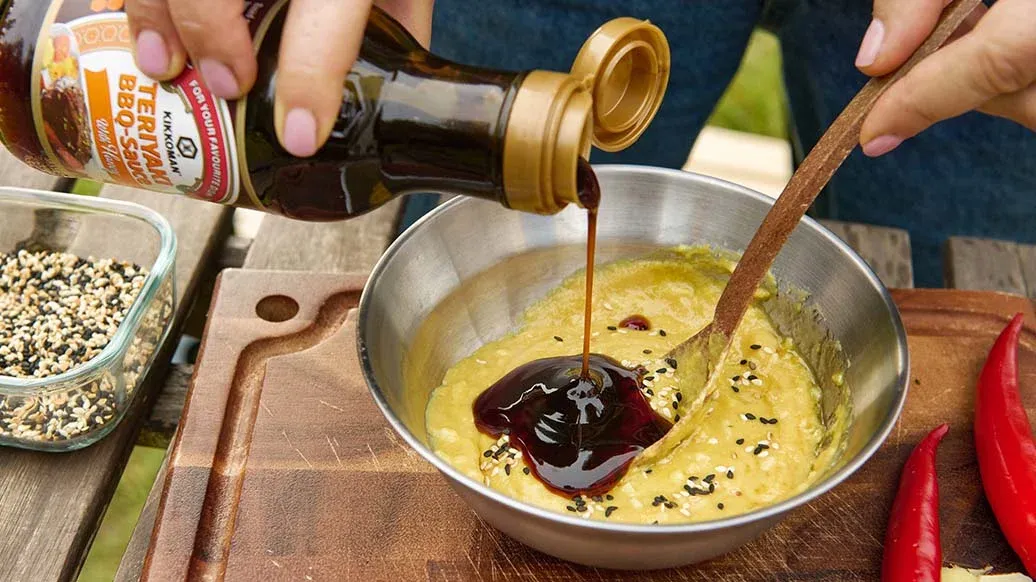 4 rkl sinappia – 2 rkl Kikkoman Hunajalla maustettu Teriyaki BBQ-kastike – ½ tl hunajaa – 1 tl raastettua inkivääriä – 1 rkl paahdettuja seesaminsiemeniä – 1 tl Kikkoman paahdettu seesamiöljy