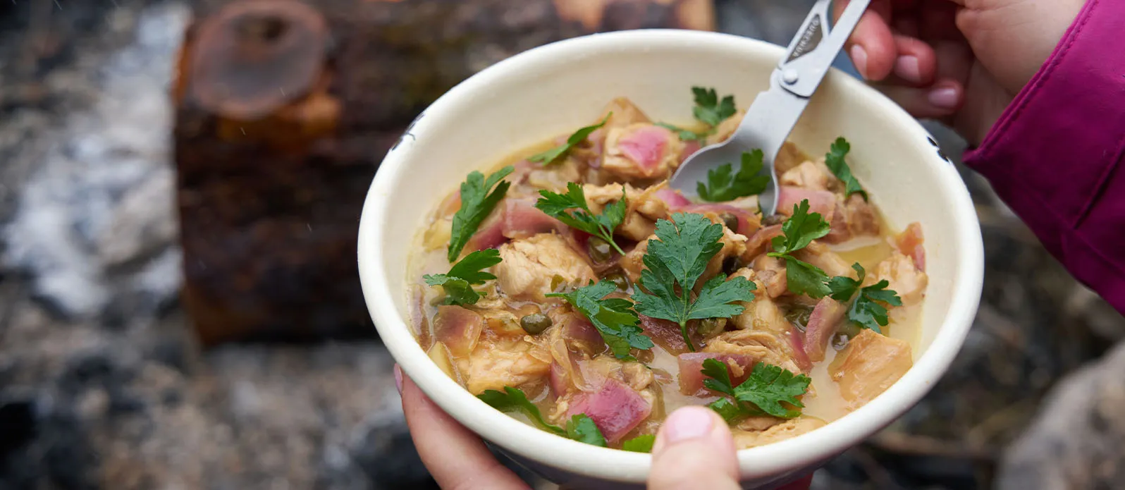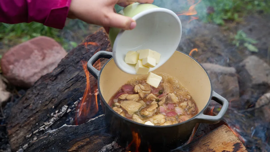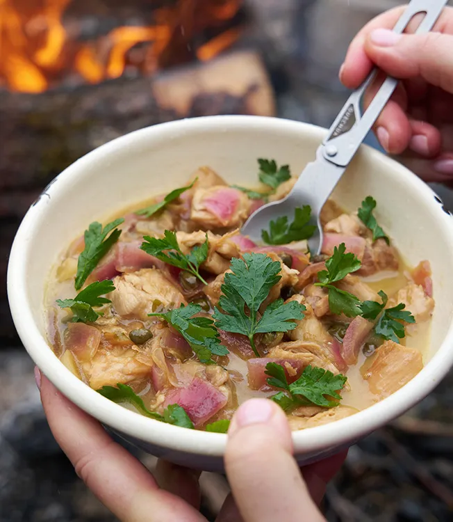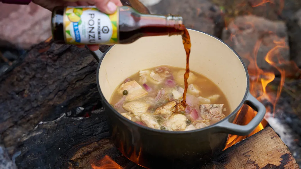Kana hautuu meheväksi Kikkoman ponzu-kastikkeessa, joka antaa ruoalle ihanan sitruksisen säväyksen. Täydellinen ateria leirinuotiolla nautittavaksi!