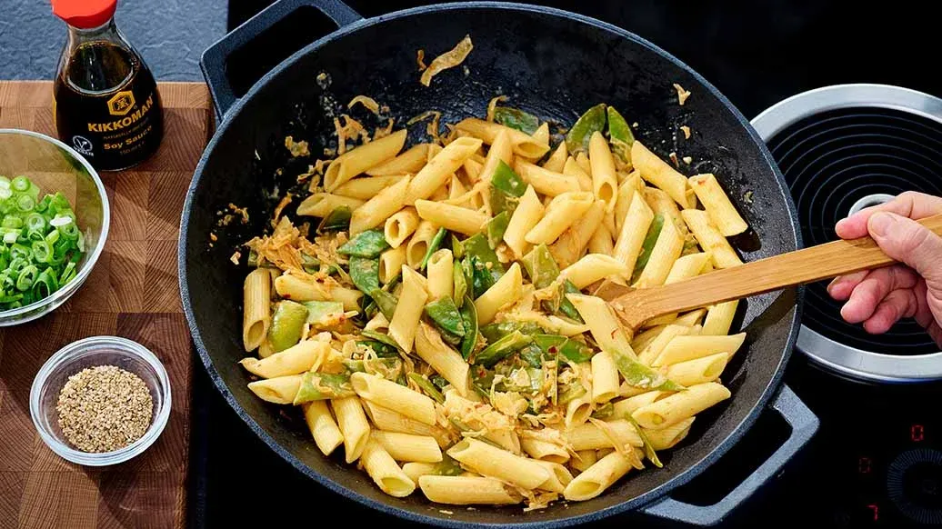 300 g penne- tai minipennepastaa – ½ tl gochujang-chilitahnaa – 2 rkl maapähkinävoita – 1 tl vaahterasiirappia – 4 rkl Kikkoman luonnollisesti valmistettu soijakastike