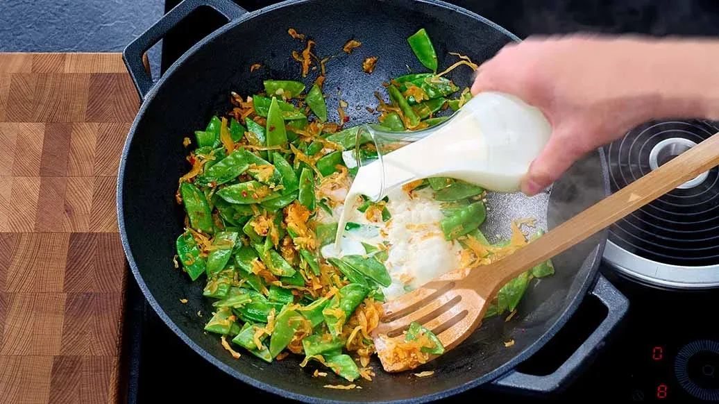 Silppua valkosipuli ja paista sitä Kikkoman seesamiöljyssä isolla wokki- tai paistinpannulla. Lisää kimchi ja sokeriherneet (puolita isommat tarvittaessa) ja paista hetki. Kaada sekaan kuohukerma, kiehauta ja anna kiehua hiljaa n. 5 minuuttia.