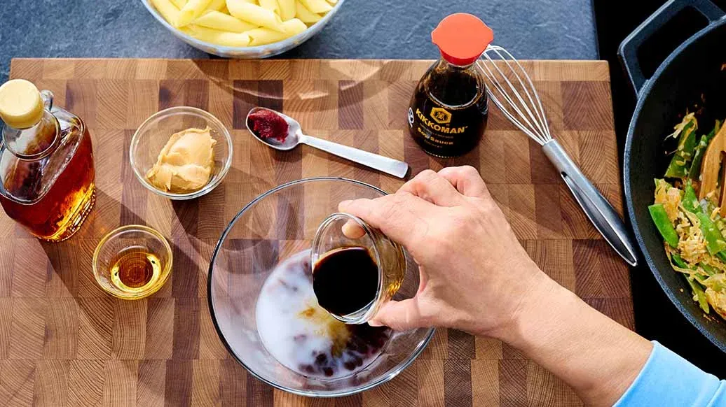 Keitä pasta pakkauksen ohjeen mukaan ja ota 100 ml keitinvettä talteen ennen pastan siivilöintiä. Sekoita keitinvesi sekä gochujang-tahna, maapähkinävoi, vaahterasiirappi ja Kikkoman soijakastike.