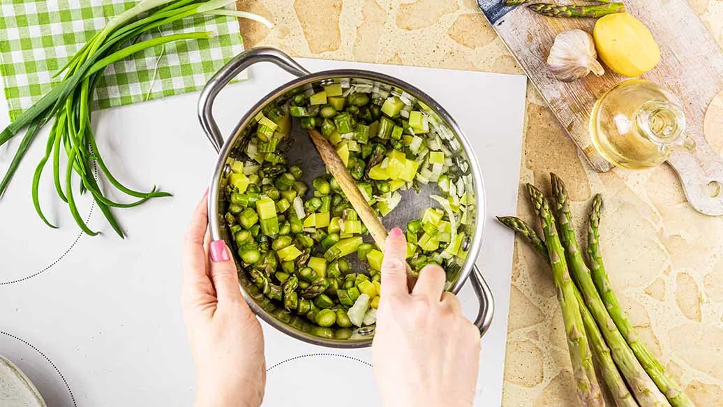 Huuhtele parsa ja leikkaa tai napsauta sormin puumainen osa tyvestä pois. Leikkaa kolmesta parsasta nuput irti ja laita sivuun. Leikkaa loput parsat n. sentin paloiksi. Kuori ja leikkaa perunat pieniksi kuutioiksi. Silppua sipuli ja valkosipuli. Kuumenna oliiviöljy ja voi paksupohjaisessa kattilassa. Lisää sipuli, valkosipuli, perunat ja paloiteltu parsa. Kuullota aineksia minuutin verran.