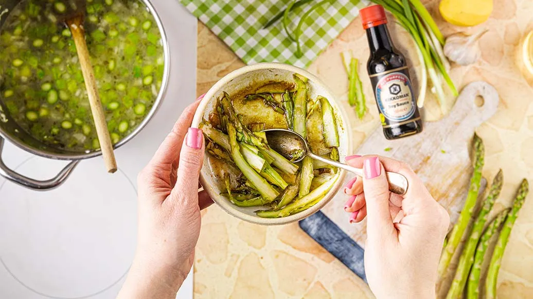 Keiton poristessa valmistele vaiheessa yksi leikatut parsan nuput. Viipaloi ne pituussunnassa ohuiksi suikaleiksi. Sekoita pienessä kulhossa oliiviöljy, balsamietikka ja Kikkoman soijakastike. Lisää parsasuikaleet ja anna marinoitua 10 minuuttia.