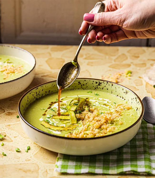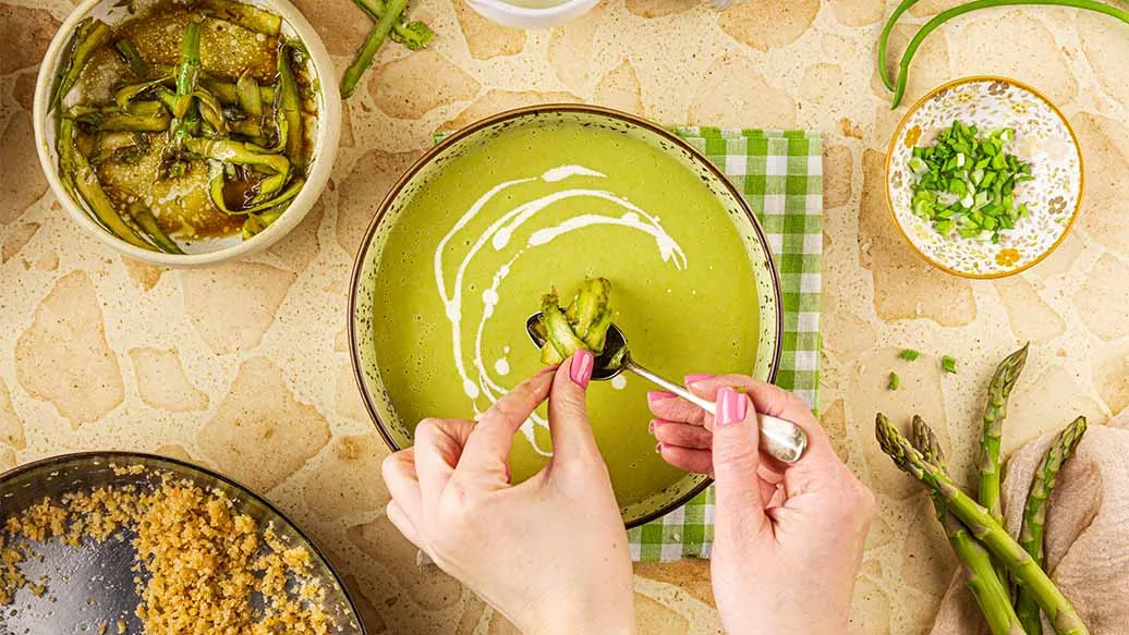 Soseuta keitto sileäksi ja mausta mustapippurilla. Jätä 1 rkl kermaa koristeluun ja sekoita loput keittoon. Annostele keitto kahteen kulhoon ja koristele lopulla kermalla, marinoiduilla parsan suikaleilla vaiheesta 3 sekä kevätsipulilla. Tarjoile rapean Kikkoman pankomurun kera.