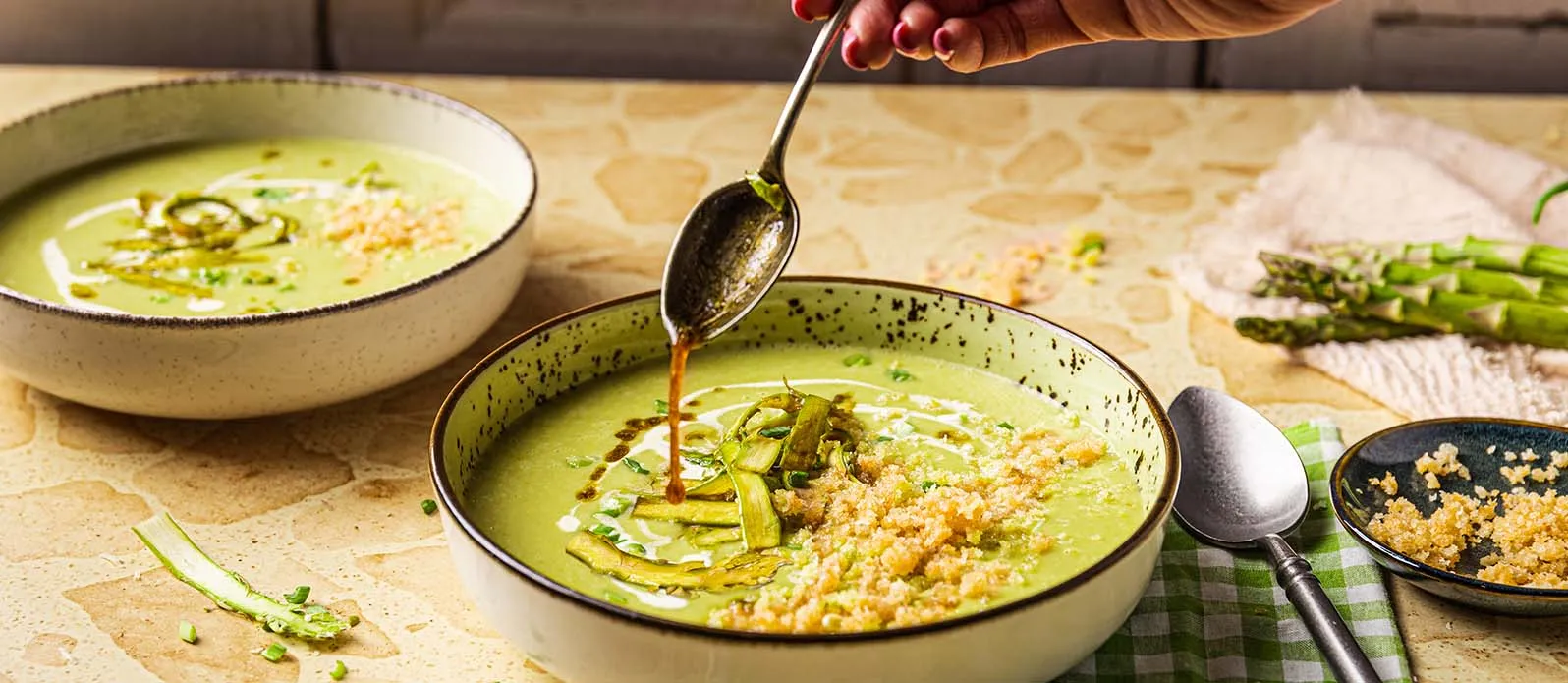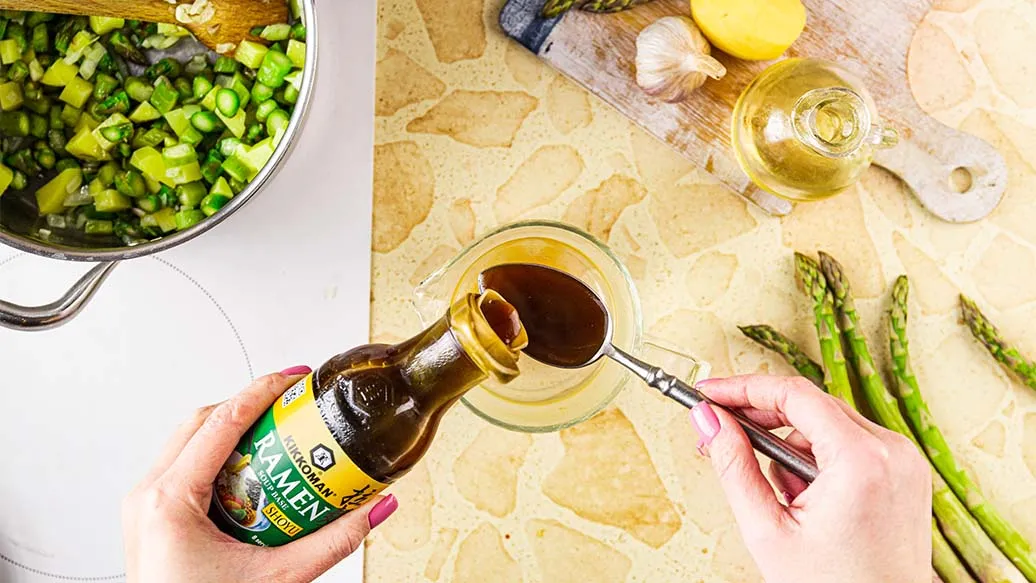Keväisen vihreässä parsakeitossa on ihanan umaminen maku Kikkoman ramen-liemipohjan ansiosta. Mukavaa kontrastia kermaiselle keitolle antaa panko-korppujauhoista ja parmesaanista tehty muruseos sekä marinoidut parsan nuput.