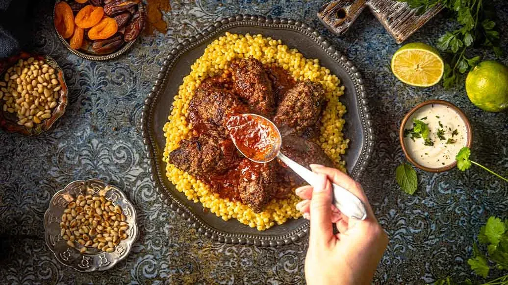 Kanelilla, kuminalla ja yrteillä maustetut naudanlihakoftat muhivat meheviksi tomaatti-soijakastikkeessa ja tarjoillaan kuskusin kera. Limetti antaa kastikkeelle raikkaan säväyksen.