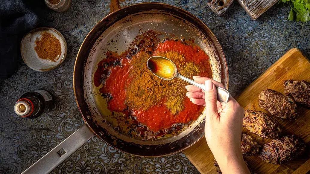 Ota koftat pannulta. Lisää paseerattu tomaatti, kaneli, kumina, chilijauhe ja Kikkoman soijakastike. Peitä kannella ja anna kiehua hiljaa 15 minuuttia.